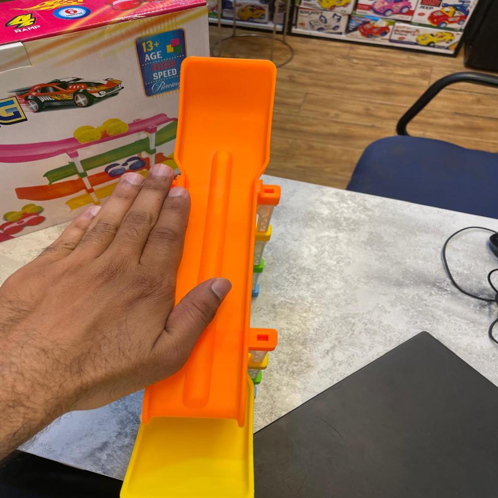 A: Ramp Racing arrives fully assembled in a boxsimply unpack it and its ready for use. Children can place cars at the top of the ramp and watch them race down, encouraging hand-eye coordination and fine motor skills.